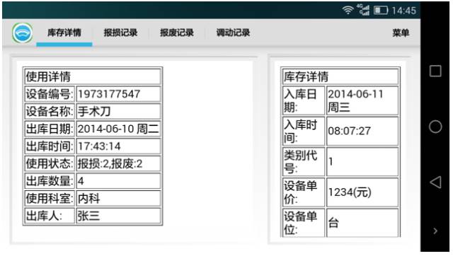 3.2 医疗设备移动管理APP 在基于智能移动终端和RFID阅读器进行开发的是实现医疗设备管理功能的移动管理系统。医院定期会对医疗设备进行维修和盘点。在未使用RFID技术和无线技术之前,医院的管理操作人员要去各个科室进行设备信息记录,将设备数量和使用情况记录下来,再将所有的数据单提交给数据录入员输入电脑数据库中。
