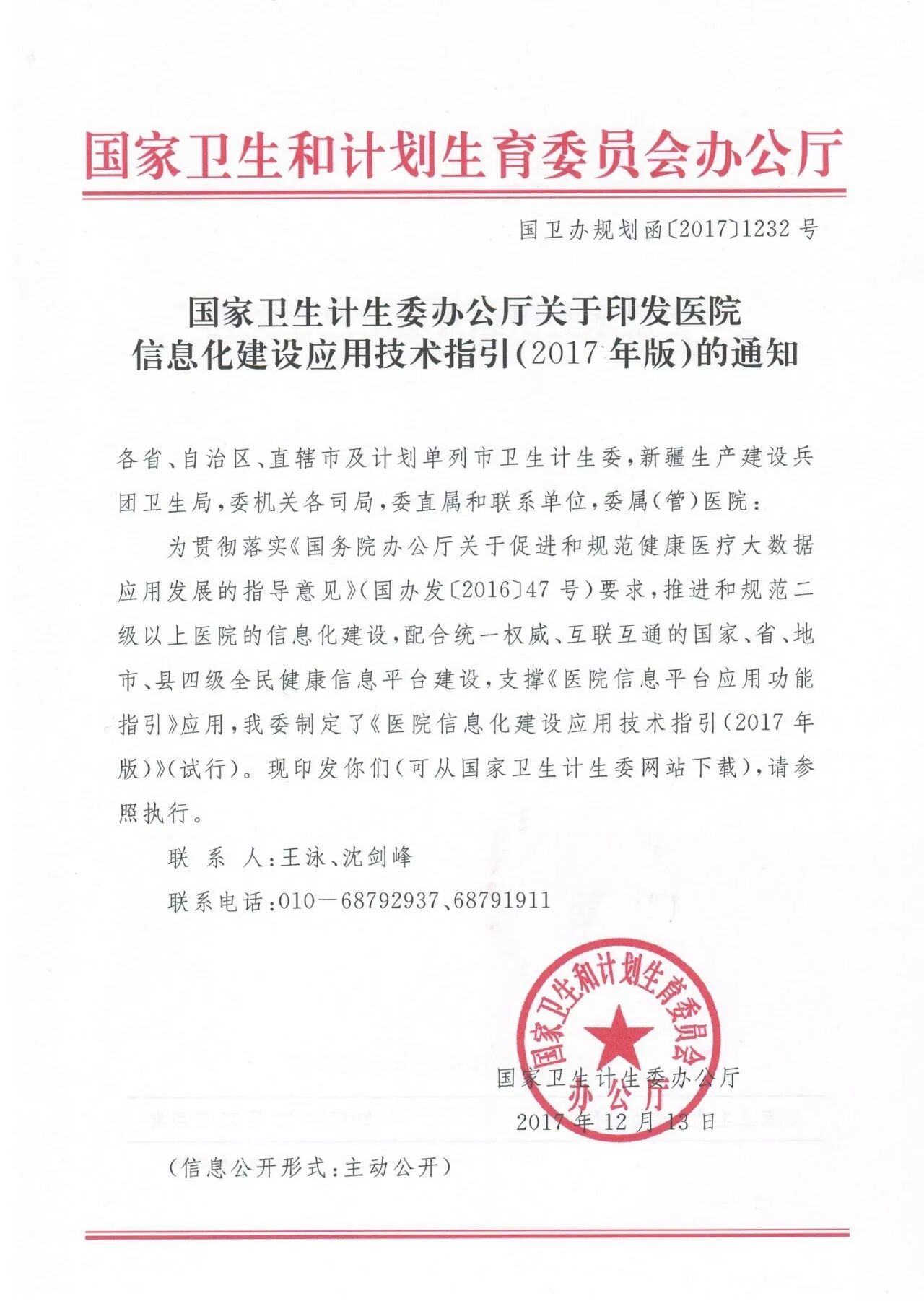 为贯彻落实《国务院办公厅关于促进和规范健康医疗大数据应用发展的指导意见》(国办发〔2016〕47号)要求,推进和规范二级以上医院的信息化建设,配合统一权威、互联互通的国家、省、地市、县四级全民健康信息平台建设,支撑《医院信息平台应用功能指引》应用,我委制定了《医院信息化建设应用技术指引(2017年版)》(试行)。请参照执行。 点击阅读原文 http://www.zgszyx.org/UploadFile/file/zgszyx/12/医院信息化建设应用技术指引(2017年)-发布稿(1).pdf