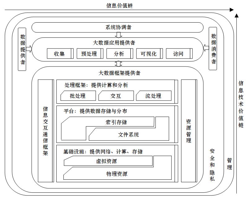 大数据参考架构 大数据参考架构是一种用作工具以便于对大数据的内在要求、设计结构和运行进行开放性探讨的高层概念模型。2017年全国信标委发布国家标准信息技术 大数据 技术参考模型,文中提出我国大数据参考架构如图1所示。