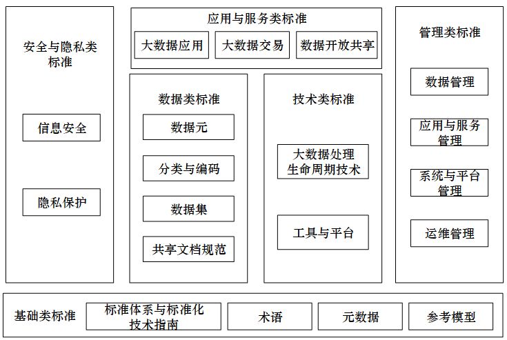 大数据标准工作组 2014年全国信标委成立大数据标准工作组,对口ISO/IEC JTC1/WG9与国际大数据标准化接轨,负责制定和完善我国大数据领域相关标准。截至2018年1月已发布信息技术 大数据 术语、信息技术 大数据 技术参考模型、信息技术 科学数据引用等5项大数据国家标准,正在制定信息技术 大数据分类指南等多项标准。2016年工作组发布《大数据标准化白皮书(2016版)》,文中指出大数据标准体系框架由基础标准、数据标准、技术标准、平台和工具标准、管理标准、安全和隐私标准、行业应用标准等7类组成。